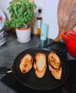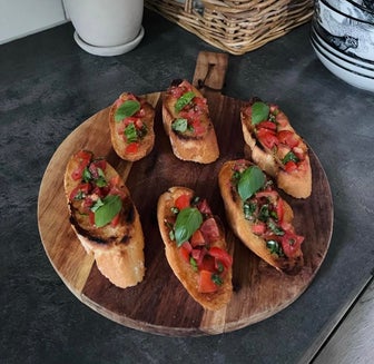 Snijd van een ciabatta of stokbrood mooie dikke sneden. Besmeer met olijfolie en grill even in een grillpan of koekenpan. Neem uit de pan en besmeer met een knoflookteen. Snijd tomaten in kleine blokjes, basilicum fijn, en meng dit door elkaar. Klein snufje versgemalen zout. En beleg de broodjes hiermee.
