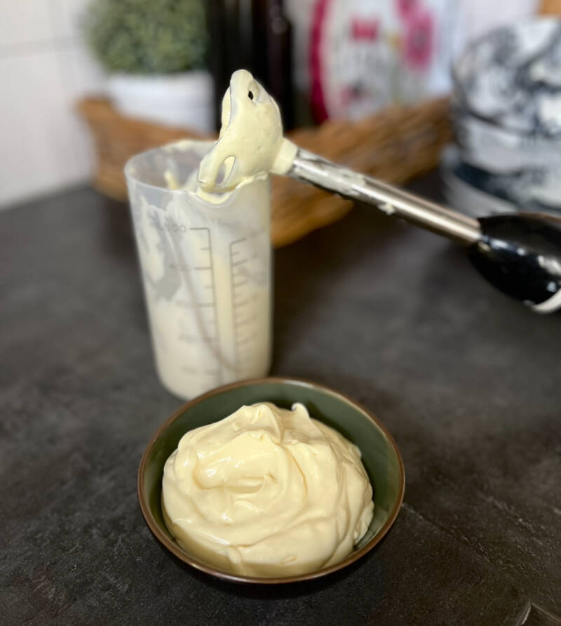 Zet nu je staafmixer aan en trek de staafmixer heel langzaam in 1 minuut naar boven. Klaar is je mayonaise.