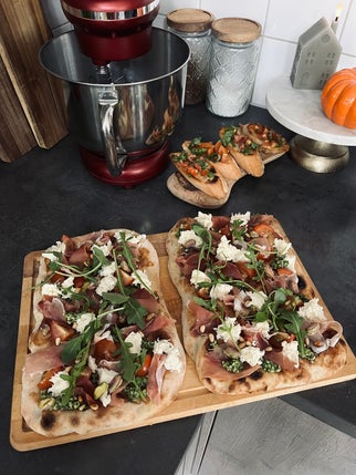 Pinsa met Parmaham, vijgen chutney, pesto, mozzarella en pistachenoten