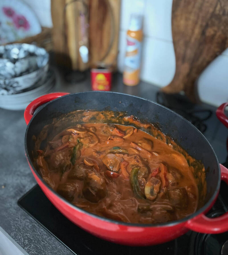 Verkruimel het bouillontablet erboven en voeg 200 ml water en de 200-250 ml room toe. Breng het aan de kook en zet dan het vuur laag. Voeg de gehaktballetjes toe. Laat 10 tot 15 minuten zachtjes pruttelen, of totdat de gehaktballetjes gaar zijn en de saus iets is ingedikt. Proef, en voeg eventueel nog zout, peper, of paprikapoeder toe. Serveer met rijst.